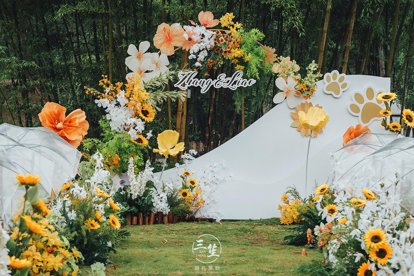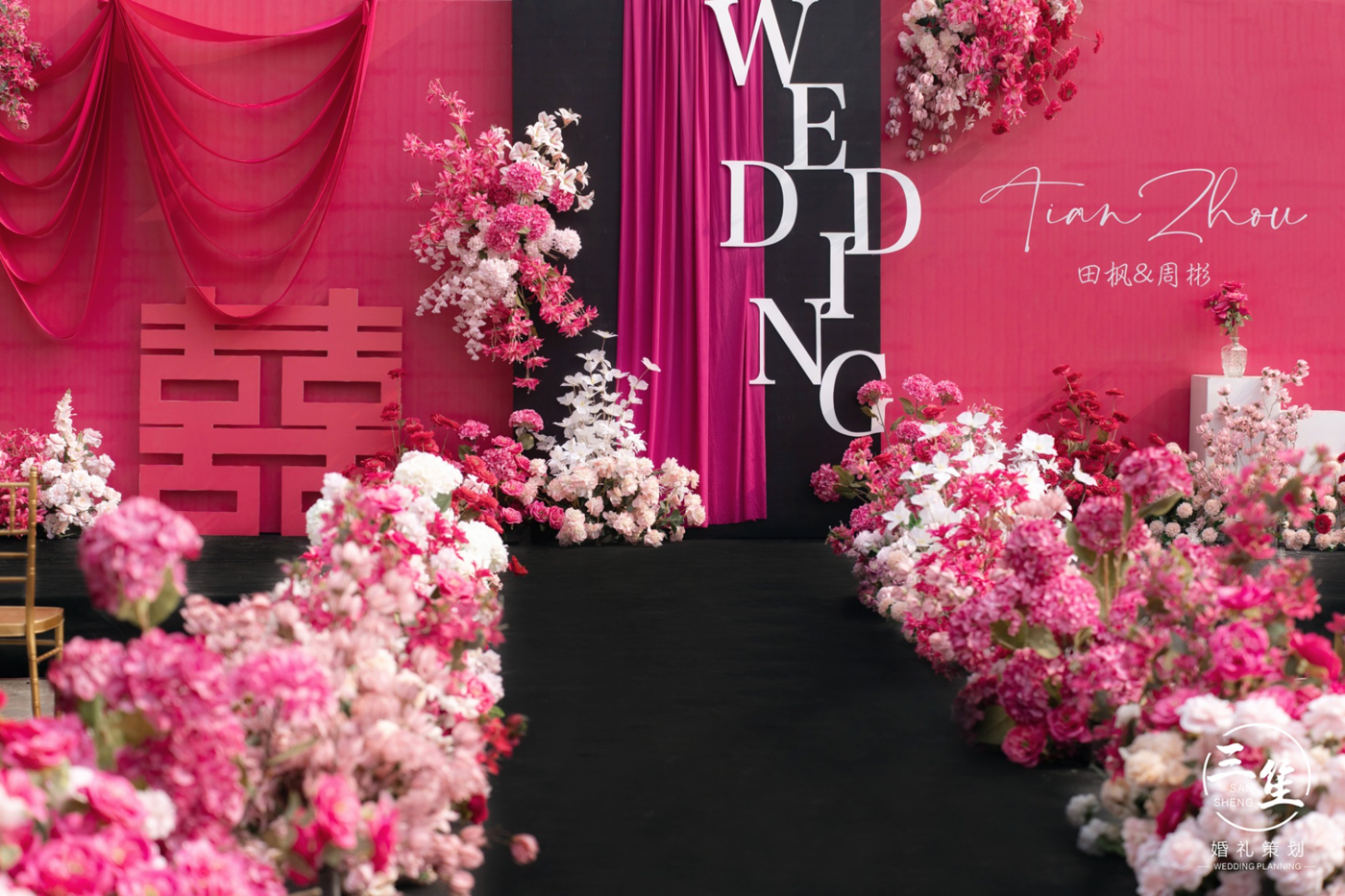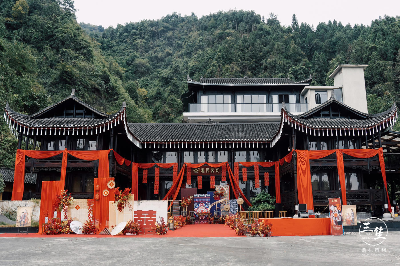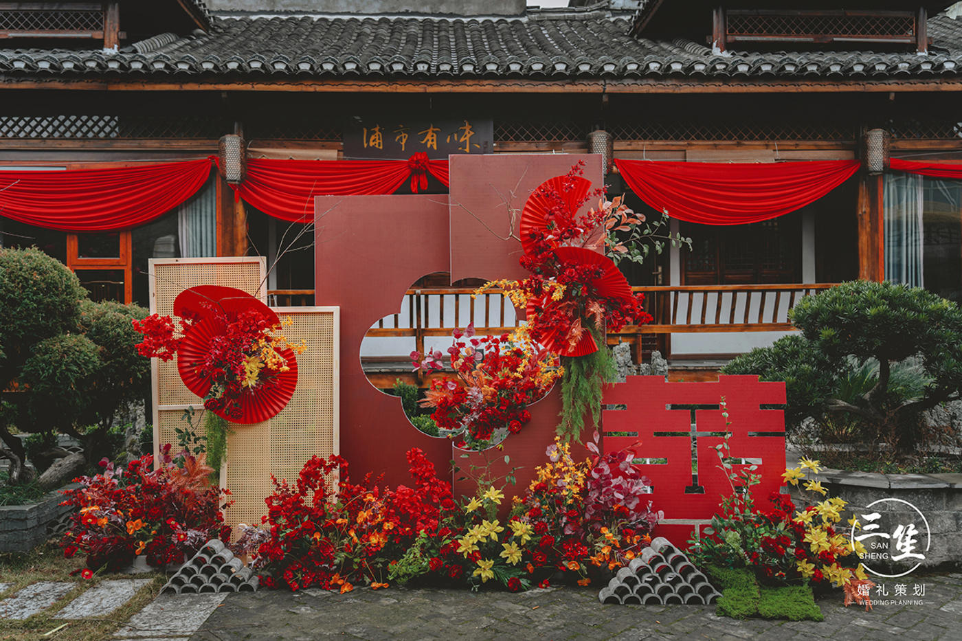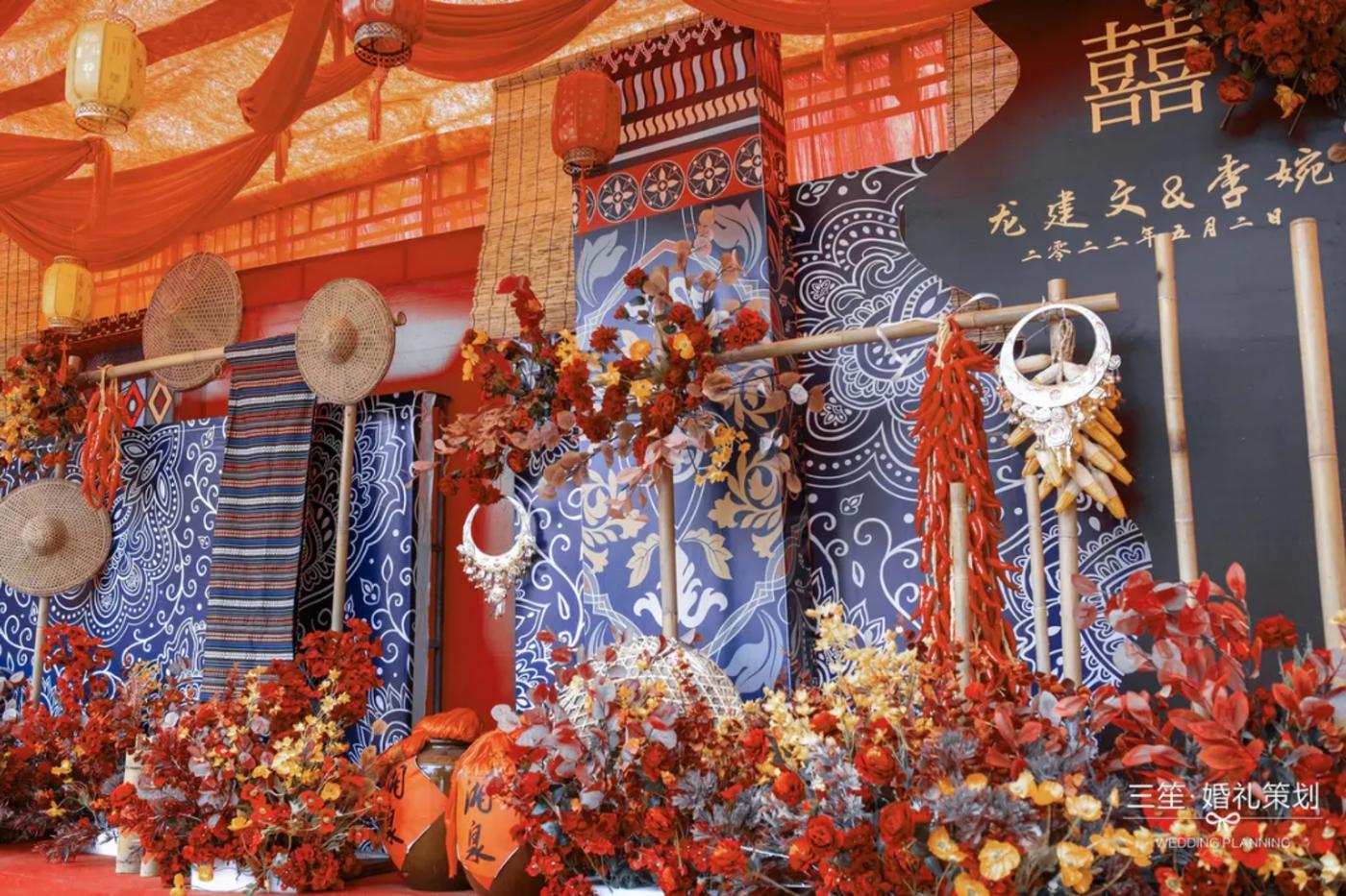 #三笙婚礼案例 灵感来自于湘西苗族民族服饰,银饰和民族原生特色物品,在设计中运用蜡染,织锦,竹器等构成主要元素,苗族特有色彩打造精致的细节,在材质上运用原生竹杆,斗笠,簸箕,背篓,木板凳等增强苗族婚礼民俗感。[更多…]